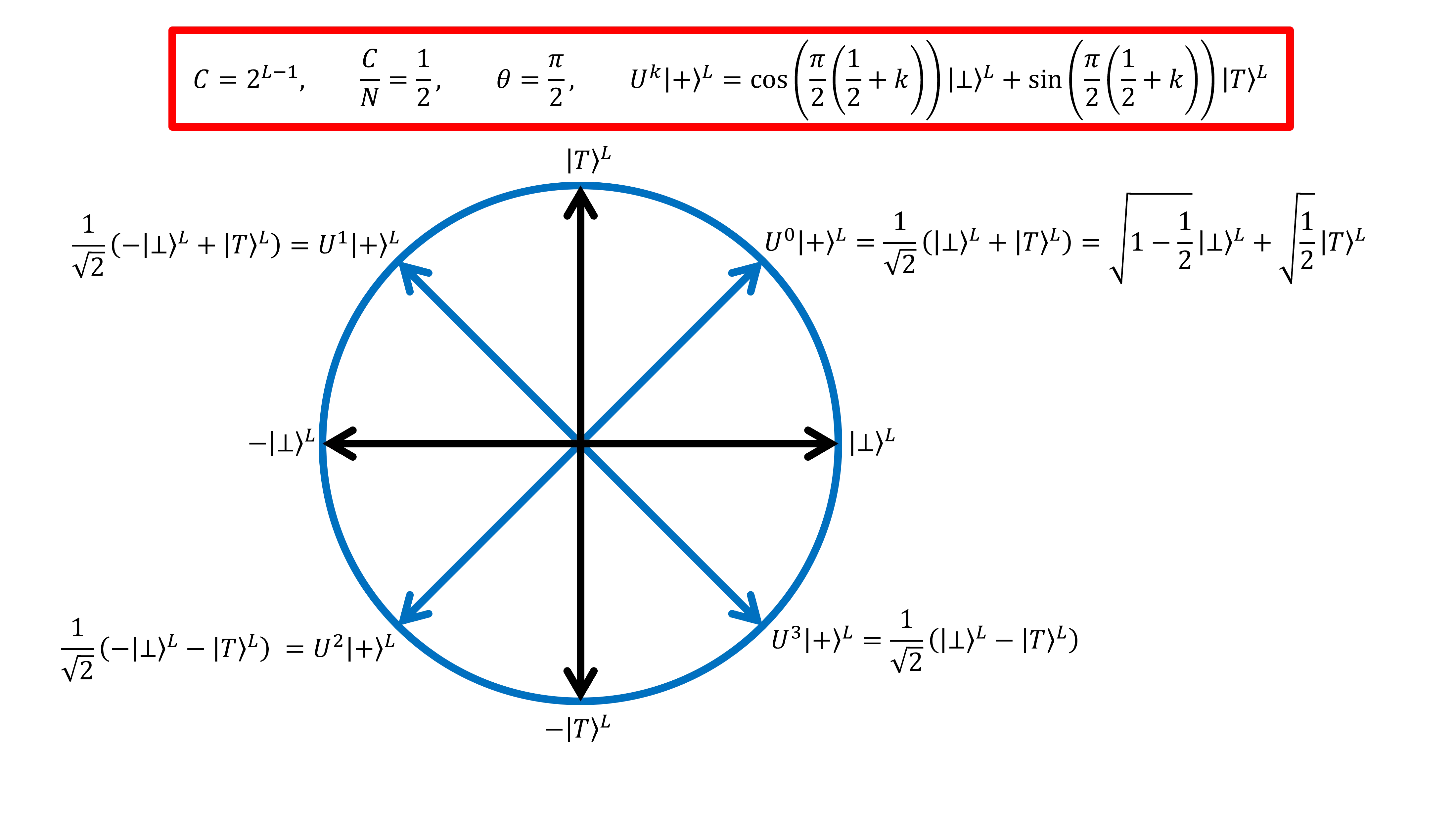 A uniform superposition of all computational basis states in a \(\beta\)-qubit register is defined as \begin{align*} \ket{+}^\beta =H^{\otimes \beta}\ket{0}^\beta =\frac{1}{\sqrt{2^\beta}}\sum\limits_{v \in\mathbb{Z}_{2^\beta}} \ket{v}^\beta =\underbrace{\sqrt{\frac{|T|}{2^\beta}}}_{\sin \frac{\theta}{2}}\overbrace{\frac{1}{\sqrt{|T|}}\sum\limits_{t \in T} \ket{t}^\beta}^{\ket{T}^\beta} +\underbrace{\sqrt{1-\frac{|T|}{2^\beta}}}_{\cos \frac{\theta}{2}}\overbrace{\frac{1}{\sqrt{2^\beta -|T|}}\sum\limits_{u \notin T} \ket{u}^\beta}^{\ket{\perp}^\beta}, \end{align*} where \(|T|=C\) is the total number of targets in the set \(T\), \(\ket{T}^\beta\) is the target superposition and \(\ket{\perp}^\beta\) is the non-target superposition. For quantum search and counting, it is useful to consider the relationship, $$ \frac{|T|}{2^{\beta}}=\sin^2\left(\pi\frac{\theta}{2\pi}\right)=\sin^2\left(\pi\left(1-\frac{\theta}{2\pi}\right)\right) \approx\sin^2\left(\pi 2^{-\alpha}\left[\pm\frac{\theta}{2\pi}\right]\right).$$ \(\beta\) must be chosen such that \(|T|<2^{\beta -1}\) and \(\alpha\) determines the number of bits in the approximations \(\left[\pm\frac{\theta}{2\pi}\right]\). The search iteration operator is defined as \begin{align*} U_\theta&=H^{\otimes\beta}\left(2\ket{0}^\beta\bra{0}-I_{2^\beta}\right)H^{\otimes\beta}\left(I_{2^\beta} - 2\sum\limits_{t\in T}\ket{t}^\beta\bra{t}\right) \\ &=H^{\otimes\beta}\left(2\ket{0}^\beta\bra{0} - \sum\limits_{v\in \mathbb{Z}_{2^\beta}}\ket{v}^\beta\bra{v}\right)H^{\otimes\beta}\left(\sum\limits_{u\notin T}\ket{u}^\beta\bra{u} - \sum\limits_{t\in T}\ket{t}^\beta\bra{t}\right), \end{align*} with the eigenstates \(\ket{\pm i}^\beta=\frac{1}{\sqrt{2}}\left(\ket{\perp}^\beta\pm i\ket{T}^\beta\right)\) satisfying \(U_\theta\ket{\pm i}^\beta=e^{\mp i \theta}\ket{\pm i}^\beta\). The search iteration can be thought of as the composition of 2 reflections, defined as $$R=H^{\otimes\beta}\left(2\ket{0}^\beta\bra{0}-I_{2^\beta}\right)H^{\otimes\beta}, \quad \Omega=I_{2^\beta} - 2\sum\limits_{t\in T}\ket{t}^\beta\bra{t},$$ where \(\Omega\) is the oracle that marks the target states with a phase factor, so that \(\Omega\ket{T}^\beta=-\ket{T}^\beta\) and \(\Omega\ket{\perp}^\beta=\ket{\perp}^\beta\). The oracle can be expressed with a function that outputs 1 for targets and 0 for non-targets, so that \(\forall t\in T, f(t)=1, \Omega\ket{t}^\beta=-\ket{t}^\beta\) and \(\forall u\notin T, f(u)=0, \Omega\ket{u}^\beta=\ket{u}^\beta\). Both cases can be expressed as \(\forall v\in \mathbb{Z}_{2^\beta}, \Omega\ket{v}^\beta=(-1)^{f(v)}\ket{v}^\beta\). To perform the quantum search algorithm, amplify the target state amplitudes by repeatedly applying the search iteration operator to produce the state, \begin{align*} U_\theta^q\ket{+}^\beta &=\cos\left(\theta\left(\frac{1}{2}+q\right)\right)\ket{\perp}^\beta +\sin\left(\theta\left(\frac{1}{2}+q\right)\right)\ket{T}^\beta \\ &=\frac{1}{\sqrt{2}}\left(e^{-i \theta\left(\frac{1}{2}+q\right)}\ket{+i}^\beta+e^{+i \theta\left(\frac{1}{2}+q\right)}\ket{-i}^\beta\right) =\frac{1}{\sqrt{2}}\sum\limits_{\zeta \in\{-1,+1\}}e^{\zeta i \theta\left(\frac{1}{2}+q\right)}\ket{-\zeta i}^\beta, \end{align*} where the number of iterations that maximizes target amplitudes is $$ q=\left\lfloor \frac{\pi}{2\theta} \right\rfloor=\left\lfloor \frac{\pi}{4\arcsin\left(\sqrt{|T|2^{-\beta}}\right)} \right\rfloor \leq \left\lceil \frac{\pi}{4}\sqrt{\frac{2^{\beta}}{|T|}} \right\rceil ,$$ then measure the state after amplitude amplification. Repeat amplitude amplification and measurement until all targets have been identified.